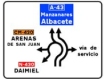 S-235a. Preseñalización, con carteles sobre la calzada, en autopista o autovía hacia cualquier tipo de carretera y dirección propia. Indica, en autopista o autovía, la dirección propia de la carretera por la que se circula y los destinos de la salida del próximo enlace. También indica la distancia a dicha salida, su número y, en su caso, la letra.