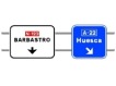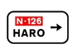 S-350a. Señalización de salida inmediata, con carteles sobre la calzada, en carretera convencional o carretera multicarril hacia carretera convencional o carretera multicarril y dirección propia. Indica, en una carretera convencional o una carretera multicarril, la dirección propia de la carretera por la que se circula y los destinos de la salida del próximo nudo cuando esta dirige hacia una carretera convencional o una carretera multicarril.