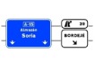 S-349a. Señalización de salida inmediata, con cartel lateral, en carretera convencional o carretera multicarril hacia autopista o autovía y dirección propia. Indica, en una carretera convencional o una carretera multicarril, la dirección propia de la carretera por la que se circula y los destinos de las salidas del próximo nudo cuando estas dirigen hacia una autopista o una autovía.