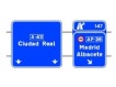 S-353a. Señalización de salida inmediata, con carteles sobre la calzada, en autopista o autovía hacia autopista o autovía y dirección propia. Indica, en una autopista o una autovía, la dirección propia de la carretera por la que se circula y los destinos de la salida del próximo enlace cuando esta dirige hacia una autopista o una autovía. También indica el número de salida y en su caso la letra.