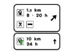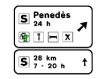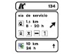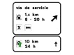 S-376. Señalización de alida inmediata a servicios en carreteras convencionales con elevada intensidad de tráfico y en todas las carreteras multicarril. Indica en carreteras convencionales con tráfico elevado y en todas las carreteras multicarril, la salida hacia los servicios señalizados. Si estos se encuentran ubicados en una población, el nombre de la misma podrá figurar en la primera línea del cartel y si están emplazados en una vía de servicio figurará la inscripción “vía de servicio”. En caso de que entre los servicios exista una estación de servicio y/o una estación de recarga, se indicará la distancia hasta la misma así como su horario de apertura. En el subcartel inferior figurará la distancia y horario de apertura de la siguiente estación de servicio y/o estación de recarga en el sentido de la marcha.